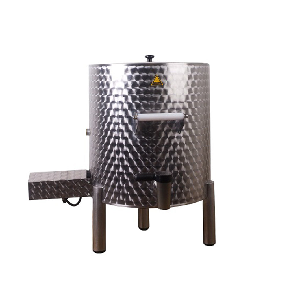 This indirect glycerine heating method reduces the risk of burning product, offering gentle, controlled processing without direct contact with heating elements. The manually adjustable thermostat ranges from 60°C to 200°C (accuracy -8/+12°C), allowing for precise thermal control. The 38mm BSP drain valve has a floor clearance of 256mm, which ensures easy and hygienic emptying, while a glycerine sight glass and overflow tube support safe operation. The temperature controller is equipped with a protective cover, preventing damage during operation and while moving the pan.