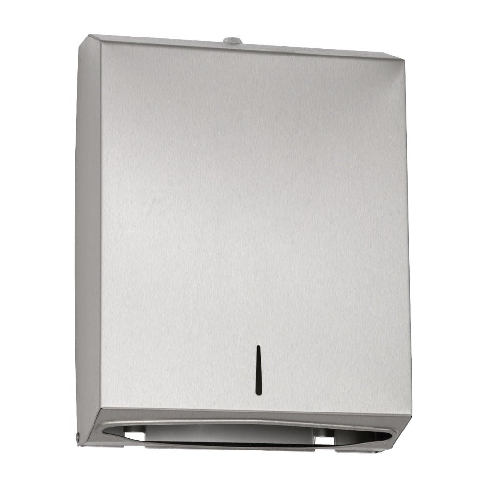 The fully welded paper towel dispenser in 304L-grade stainless steel is lockable and can be wall mounted. Finished in brushed satin, this excellent product dispenses folded towels with ease and minimises waste.