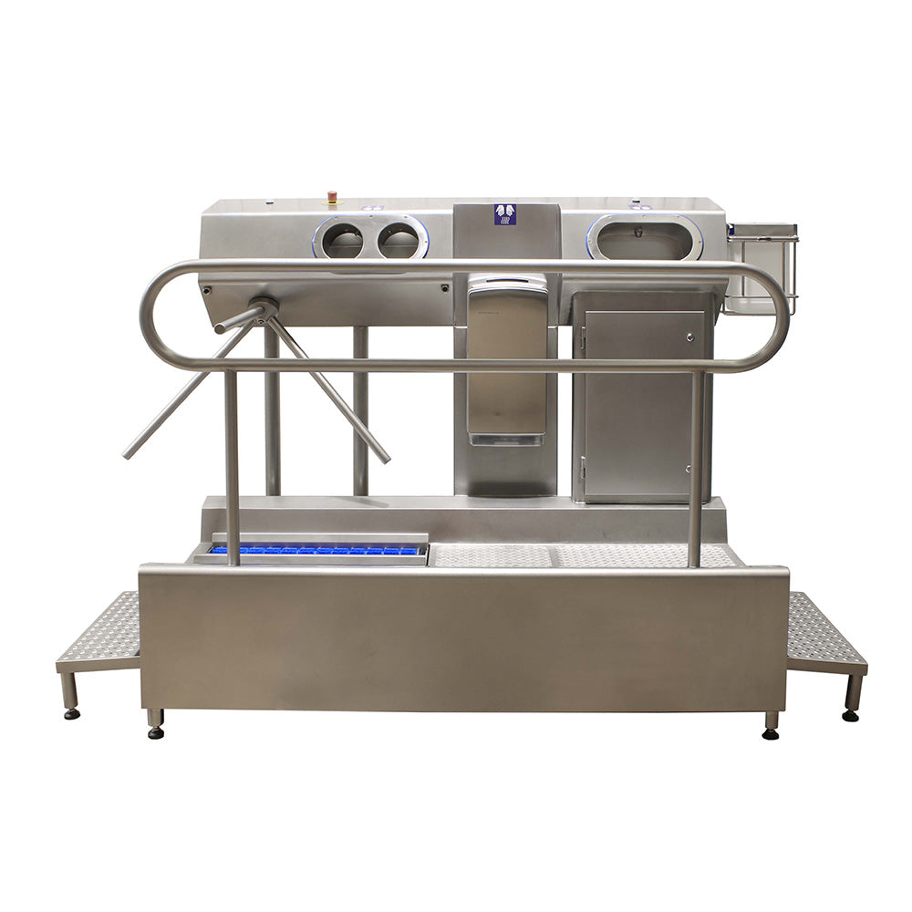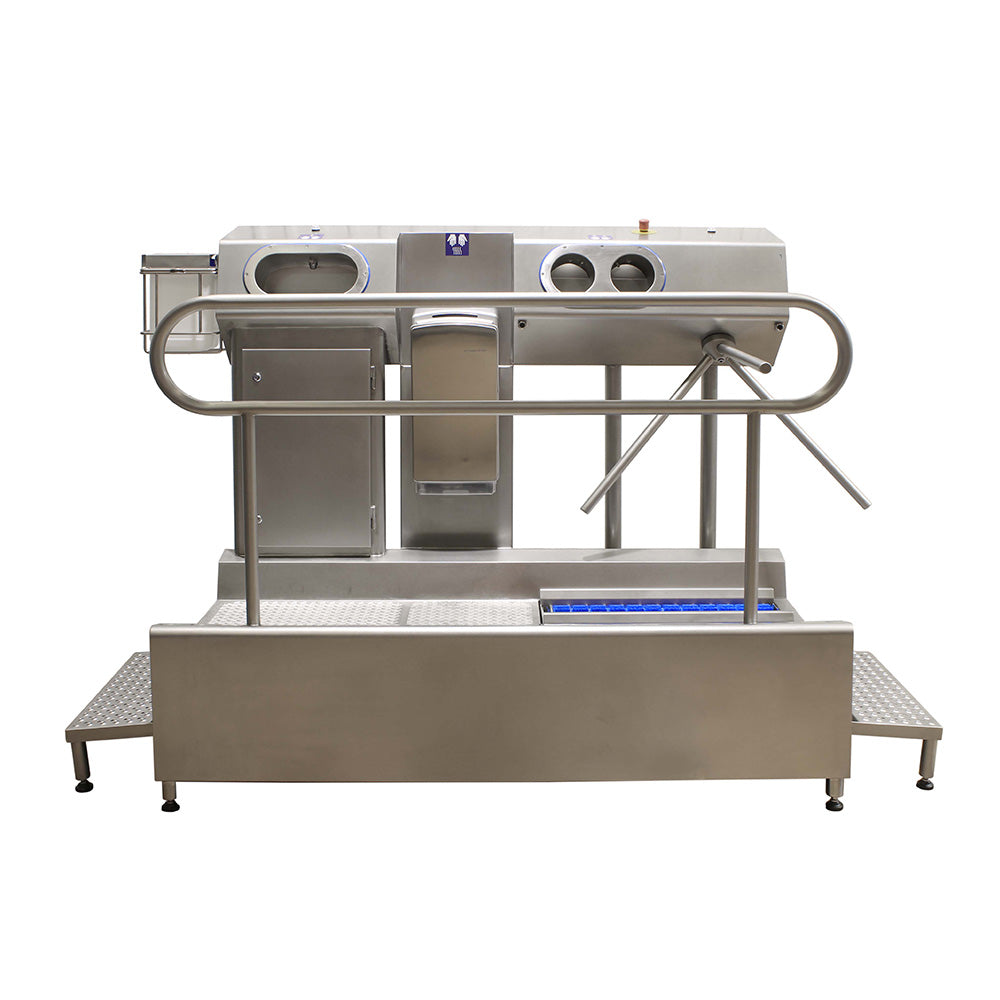 In addition to the shoe sole washer, the integrated hygiene station consists of both a soap and sanitiser dispenser with the hand dryer positioned after the soap dispenser to dry the operatives’ hands before sanitising, The operative then enters the production area through the turnstile which automatically allows entry once the hands have been sanitised.