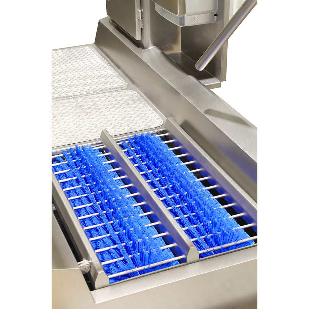 The unit features a green/red (go/stop) light indicator, and once the sanitiser sensors are activated, the turnstile unlocks, allowing operatives to pass through. Also in the concealed column housing a TFT touch panel to allow for easy and simple adjustment to the amount of liquid dispensed and station reset time and the sanitizer solution bottle and an anti-panic function which stops the brushes and unlocks the turnstile to allow operatives to exit an area quickly in and emergency. It also offers a tool-free, quick, and easy-to-remove brushes for effortless cleaning between shift and maintenance.