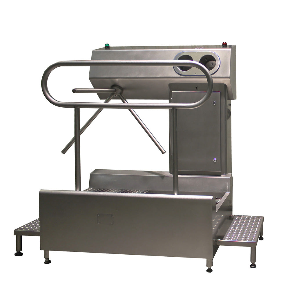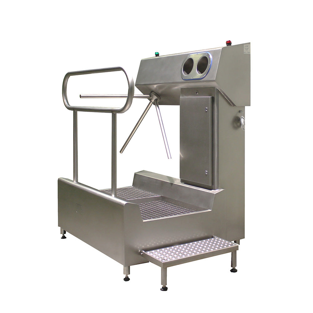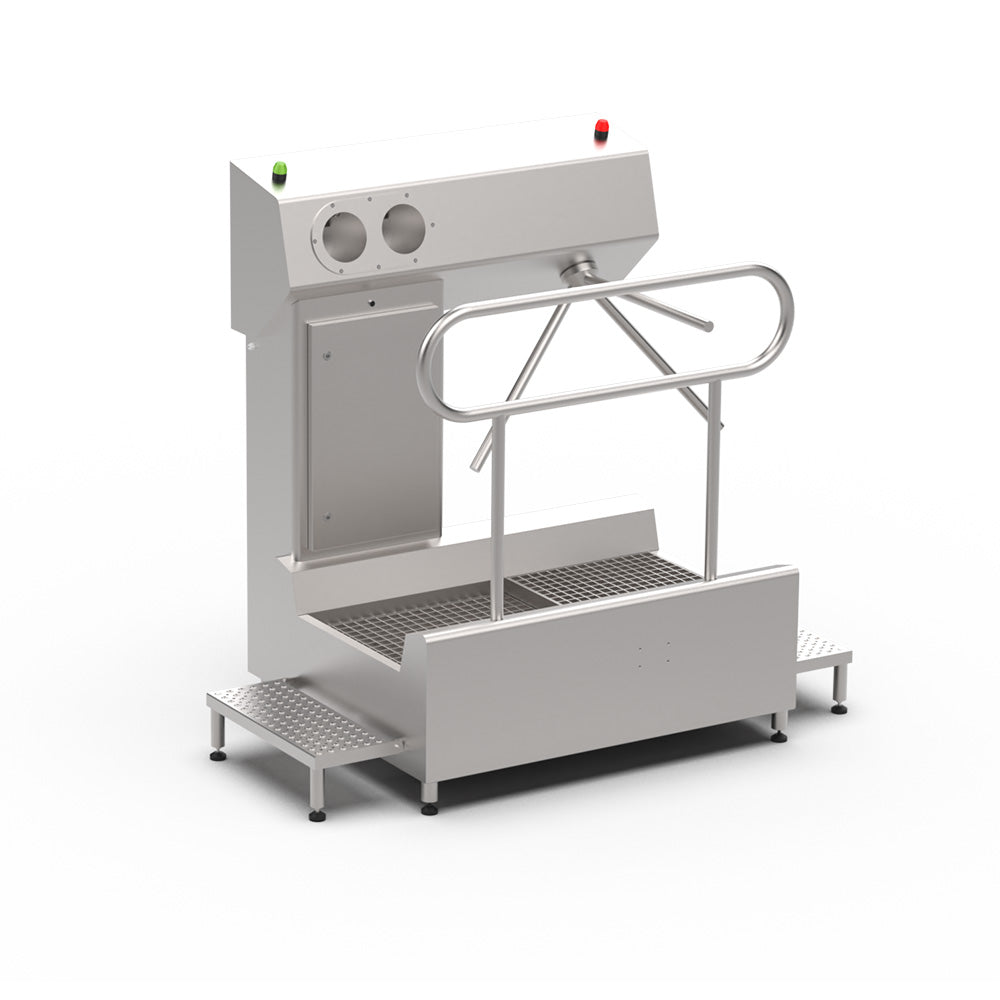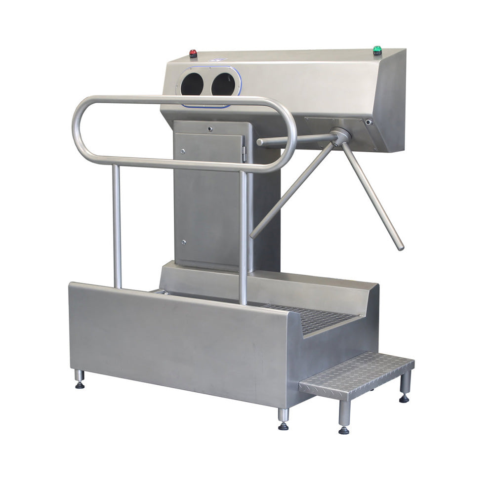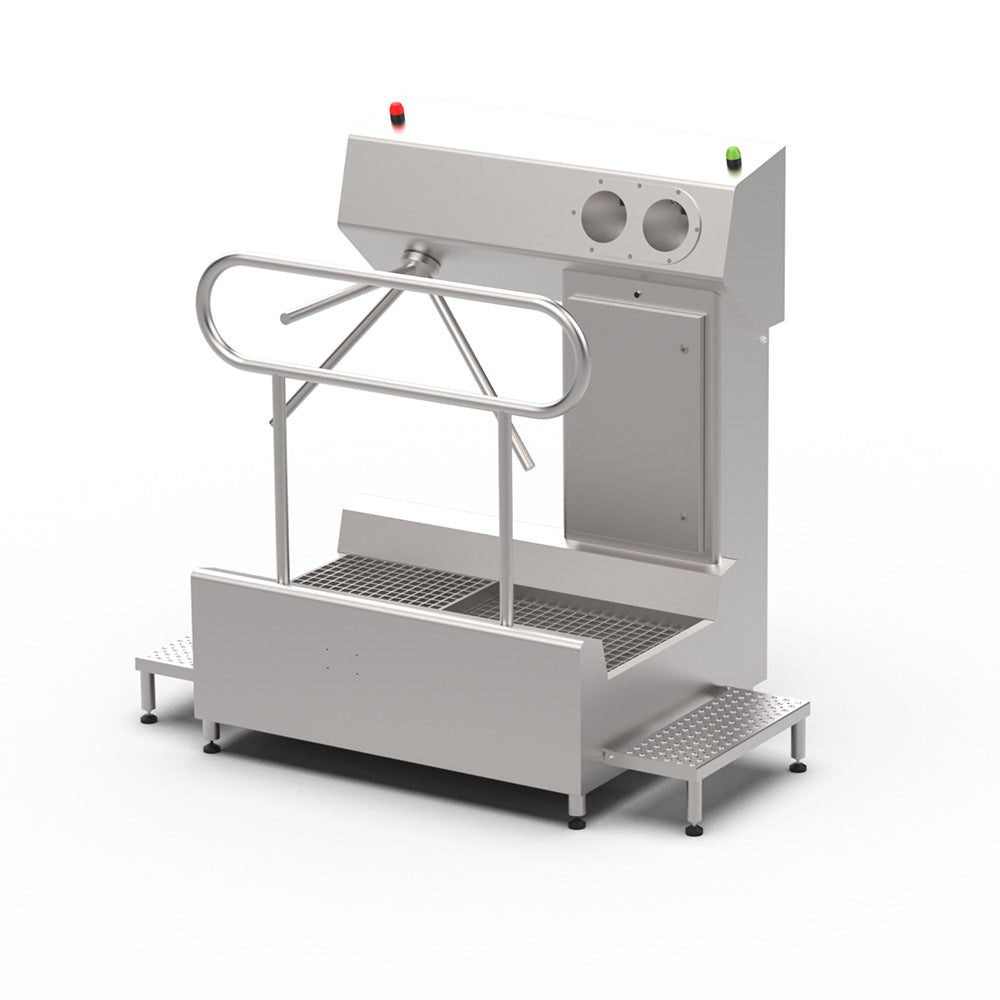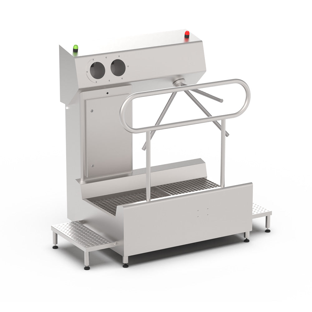 As you step onto the unit, your footwear is submerged in disinfection liquid, and then you proceed to the dripping grate to remove any excess liquid. Simultaneously, both hands (palms up) enter the disinfection chambers, where they are sprayed once sensors activate. The unit features a red/green (stop/go) light indicator, and once the sensors are activated, the turnstile unlocks, allowing operatives to pass through