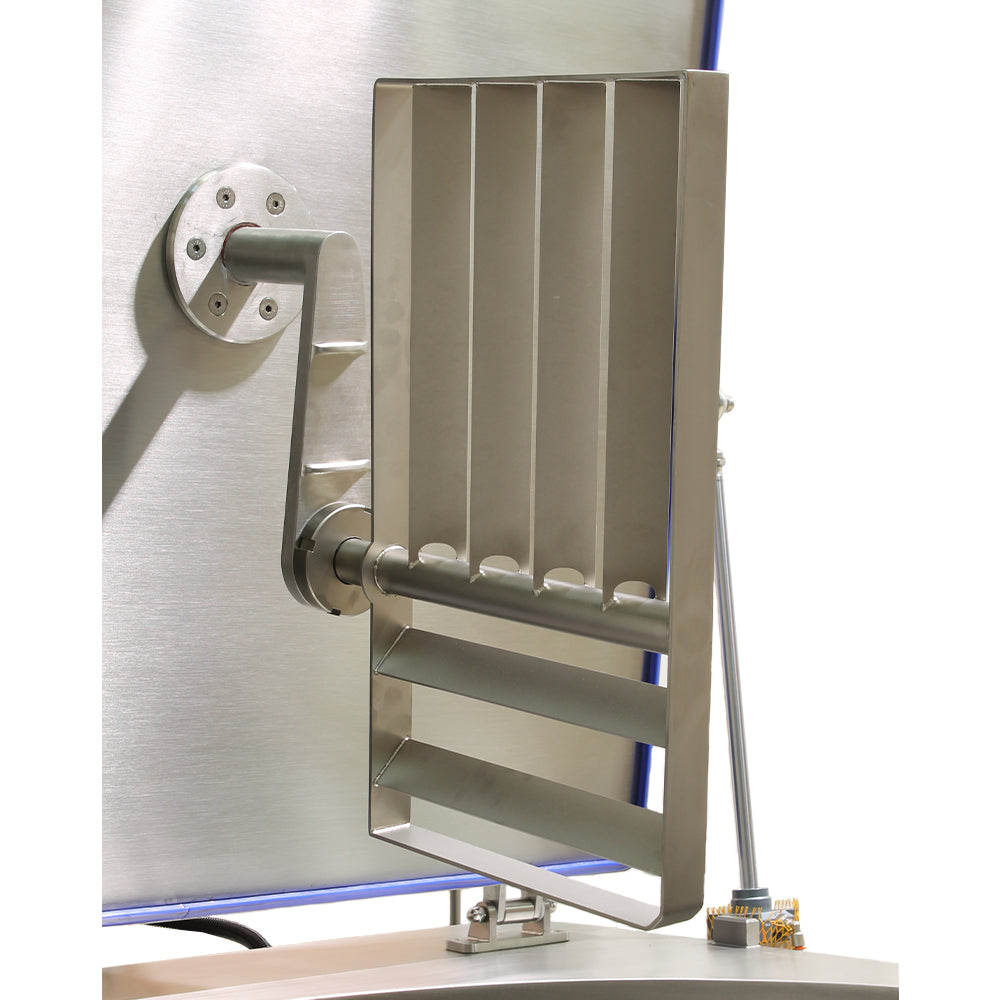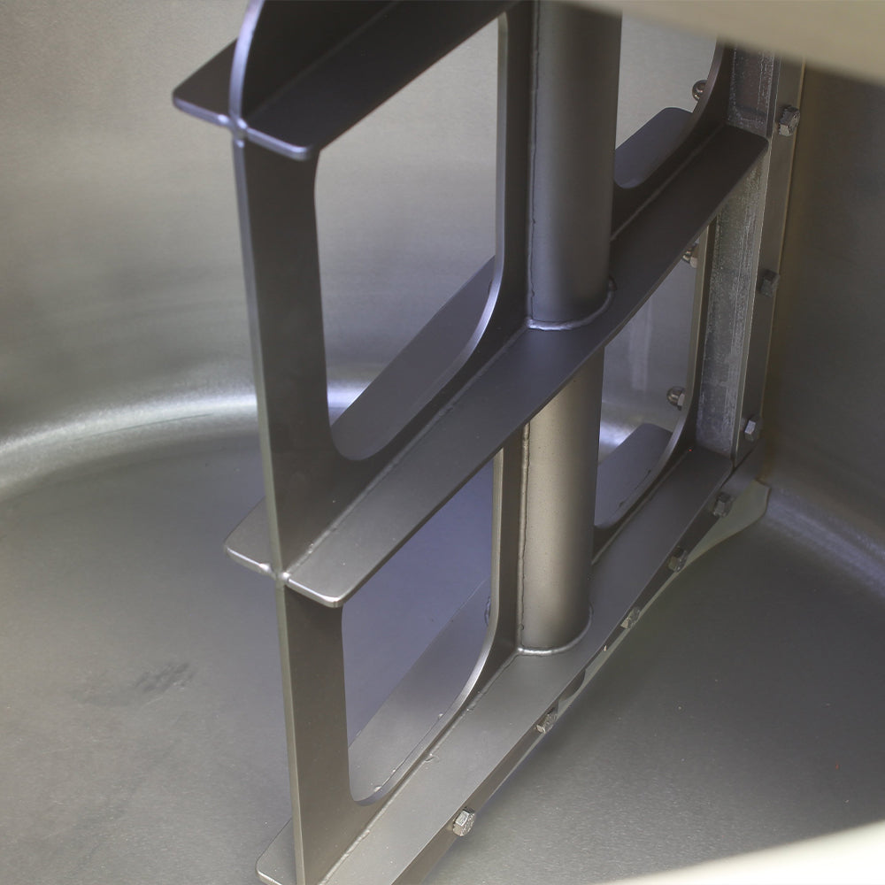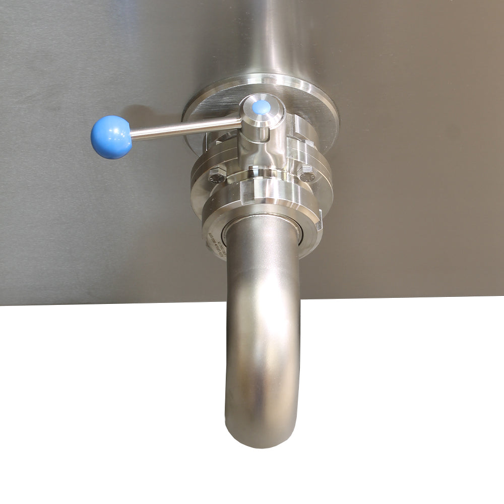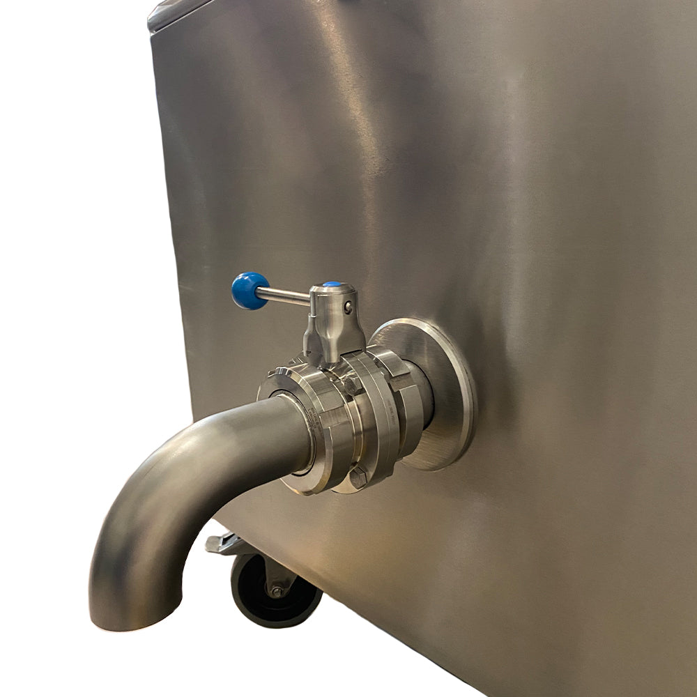Our indirect glycerine heating method reduces the risk of burning product, offering gentle, controlled processing without direct contact with heating elements. The touchscreen HMI programmable controller allows operators to set temperature (recommended maximum temperature of 130°C ), processing time and variable stirring speed with ease, giving full control over batch consistency and quality. The boiler is also insulated for thermal efficiency, once the three heating elements are turned off, the internal temperature remains high for several hours, reducing energy consumption between batches. The integrated stirrer provides controlled, continuous mixing which is ideal for semi-liquid products such as sauces, creams and emulsions. Built-in safety interlocks automatically disengage the agitator when the lid is lifted, reducing operational risk. The pneumatically assisted lid lifts smoothly and locks securely in the open position for safe, hands-free filling. The DN50 drain valve has a floor clearance of 389mm, which ensures easy and hygienic emptying, while a glycerine sight glass and overflow tube support safe operation.