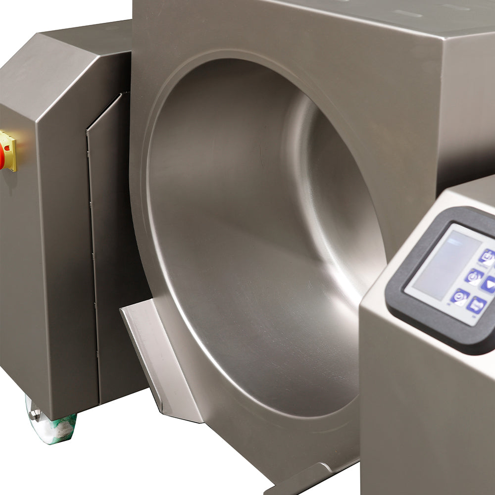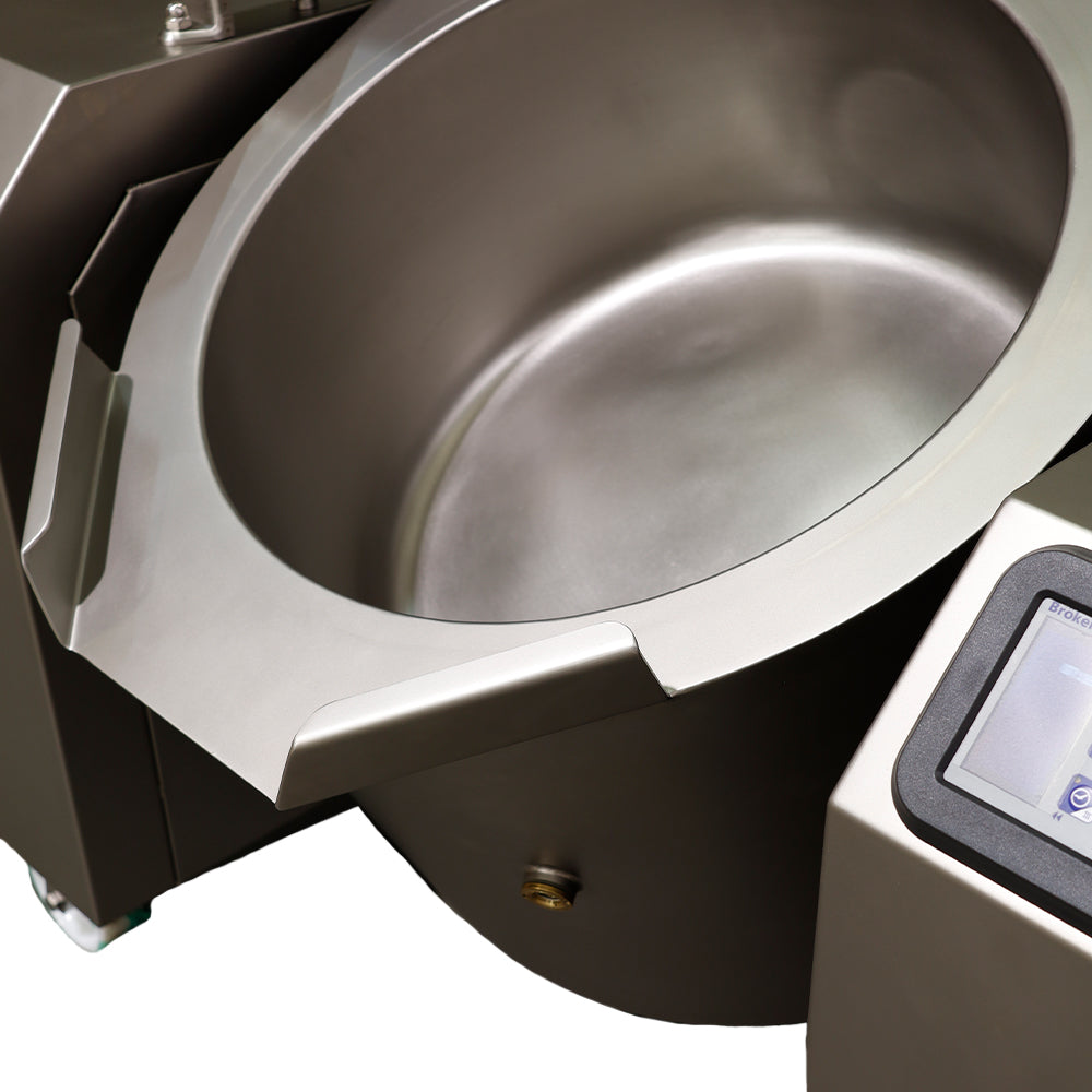 This indirect glycerine heating method reduces the risk of burning product, offering gentle, controlled processing without direct contact with heating elements. The touchscreen HMI programmable controller allows operators to set temperature control over the pan temperature (0–130°C), core temperature (0–99°C), and processing time (up to 99 hours) giving full control over batch consistency and quality. Its manual, 100° tilting mechanism enables safe, controlled emptying while the reinforced, thermally insulated outer shell helps retain heat for longer post-operation, supporting energy efficiency. Safety features include a tilting lock during heating and a thermal cut-out that protects against overload. The pan's compact footprint, castor-mounted mobility and manual lid with self-balancing hinge support ergonomic operation and flexible installation.
