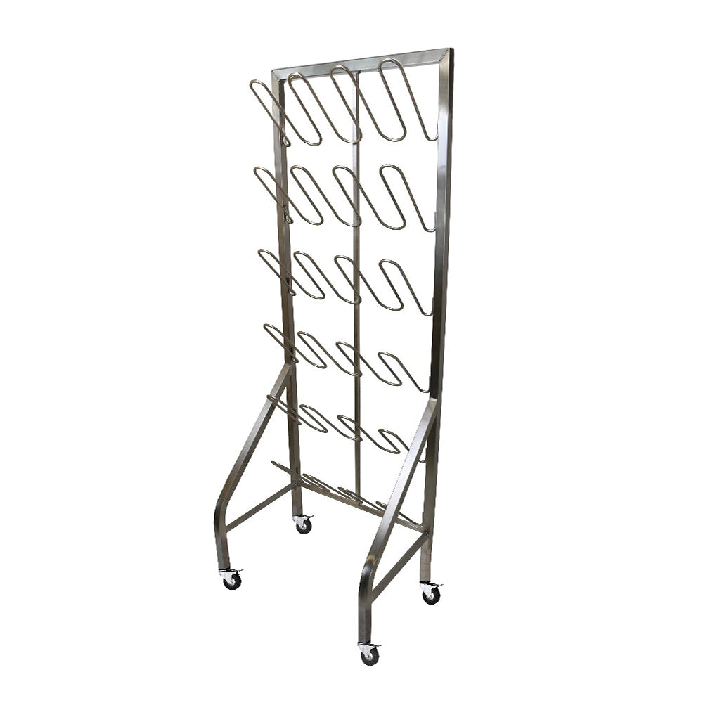 Our stainless steel mobile shoe rack is lightweight and comes with a hygienic, easier to clean, diamond leg bracing and also with a continuous piece of shoe prongs. We have removed every piece of plastic to minimise risks and its reduce footprint makes it space saving while storing the same number of pairs.