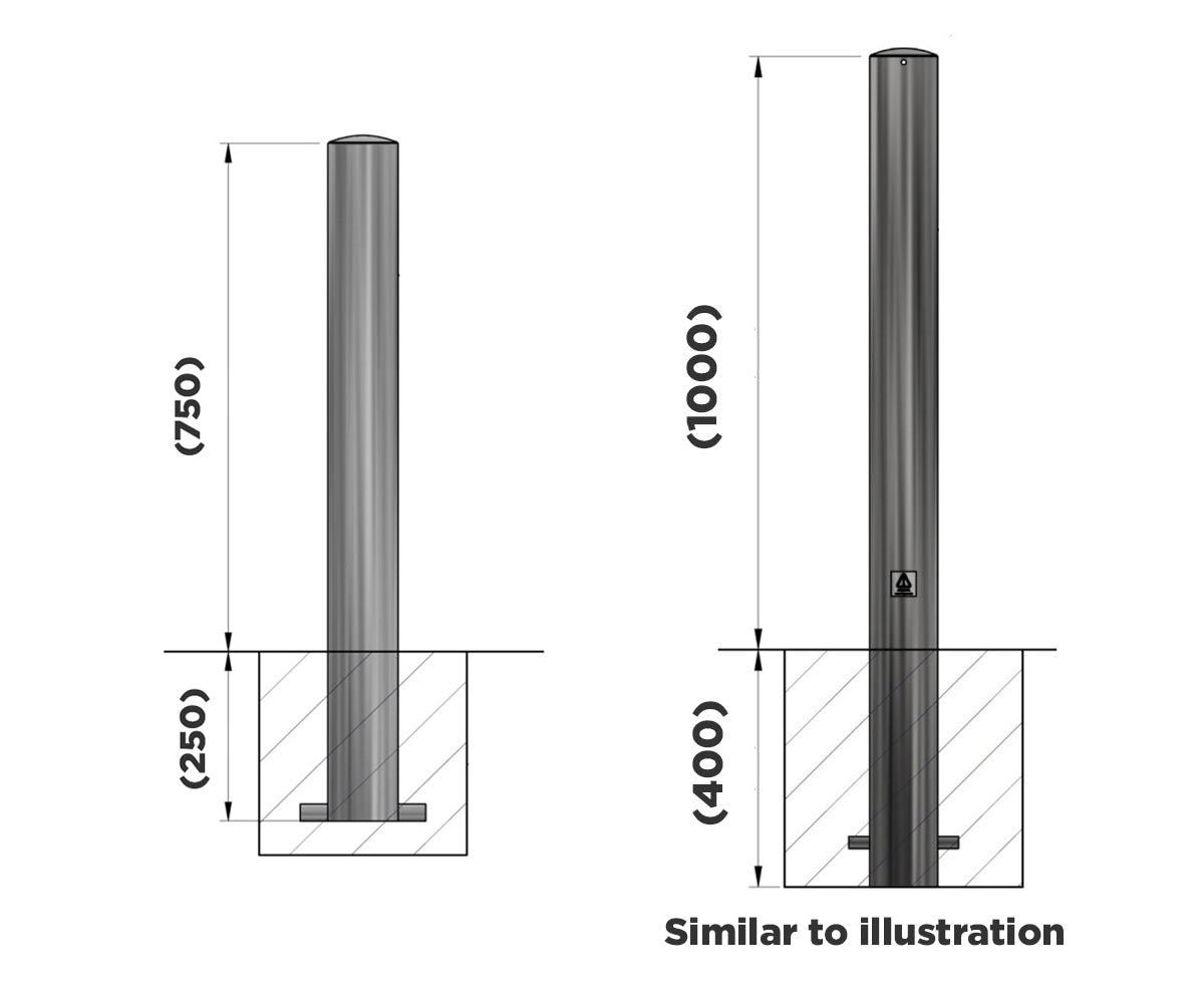 Featuring a sleek, semi-domed top, these bollards provide robust protection and add a modern touch. Available in diameters ranging from 48mm to 204mm and heights of 750mm above ground (1000mm overall) to 1000mm above ground (1400mm overall), they offer versatile solutions for safeguarding sensitive areas and managing both pedestrian and vehicle flow.