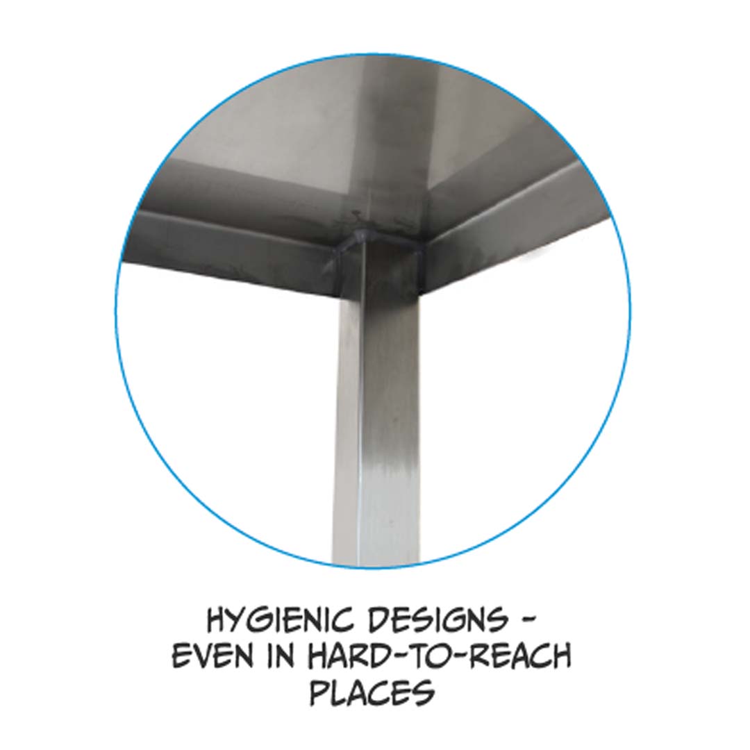 Finished in brushed dull polish, it comes with 304L-grade stainless steel construction. The stainless steel adjustable feet with non-marking, rubber base lend stability and strength to the unit, with stainless steel castors available for mobile versions for added flexibility. It features a hidden framework and single rear tie bar which facilitates the simple fitting of add-on units. The space underneath can also be utilised for extra storage.