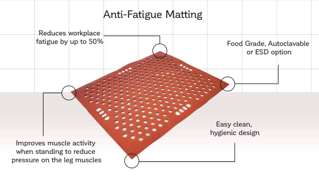 Teknomek’s anti-fatigue matting range has been proven to reuce workplace fatugue by up to 50%, and there are 3 different variations to choose from, Food grade, ESD and autoclavable. The food grade is made from 100% anti-microbial nitrile rubber which prevents the growth of bacteria and other contaminants. It is resistant to vegetable and fish oils, animal fats and citrus liquids and it's open underside allows fluids and particles to pass through, and the holes make for quick and easy cleaning with a hose.